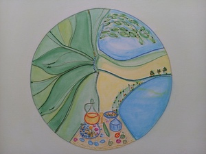 2009aquarel, kerkje in landschap
